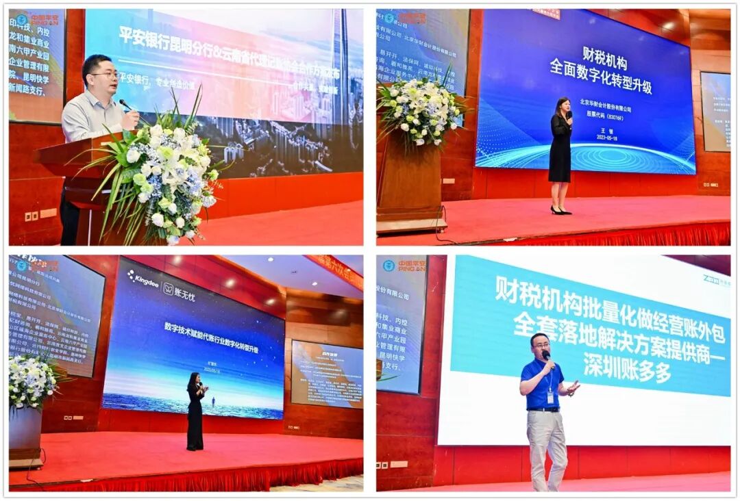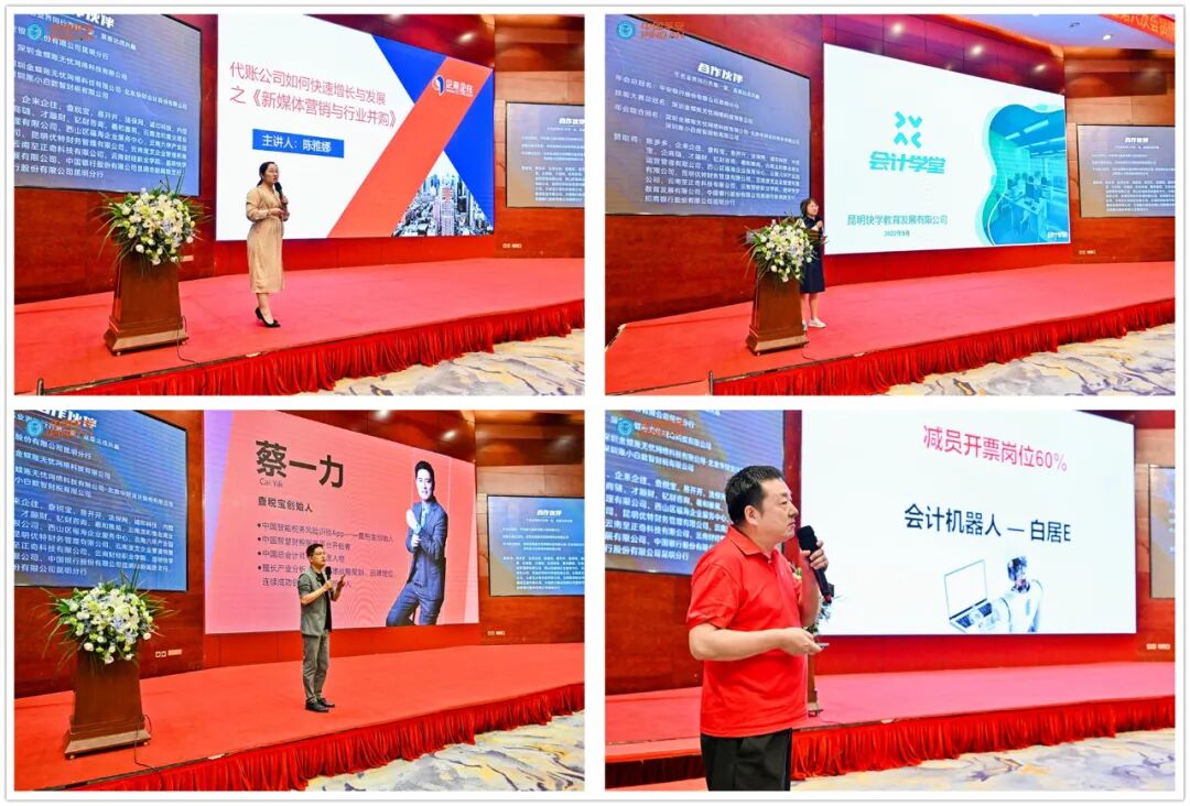 在本次大会上为了让全省的兄弟协会、会员单位和同行可以和国内优质的平台、企业、国内行业领军人物对话交流,协会还甄选了十余家国内的顶流合作伙伴,包括平安银行昆明分行、金蝶账无忧、华财股份、企来企往、账多多、会计学堂、查税宝、法保网、易开开、诚印科技、内控宝、才蹦财、钇财咨询等,在现场分别进行了交流分享。对接现场一手资源,共享平台发展红利。